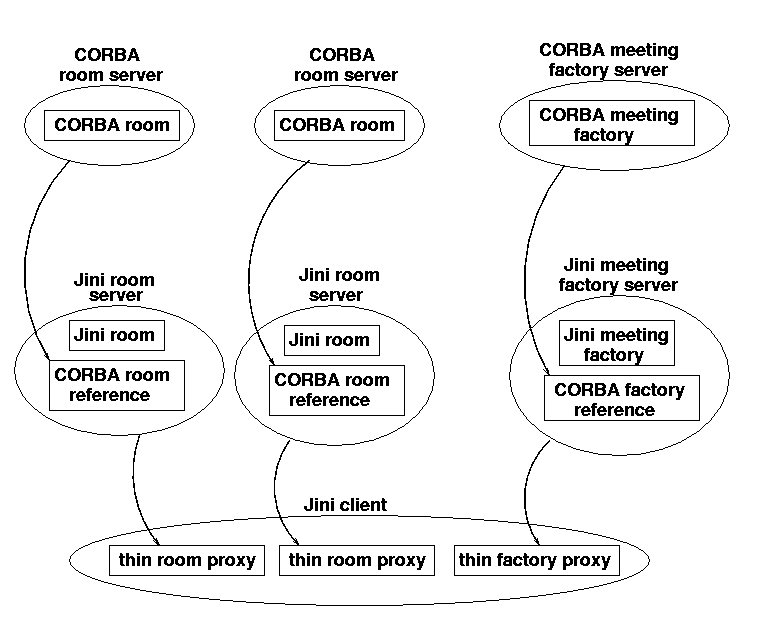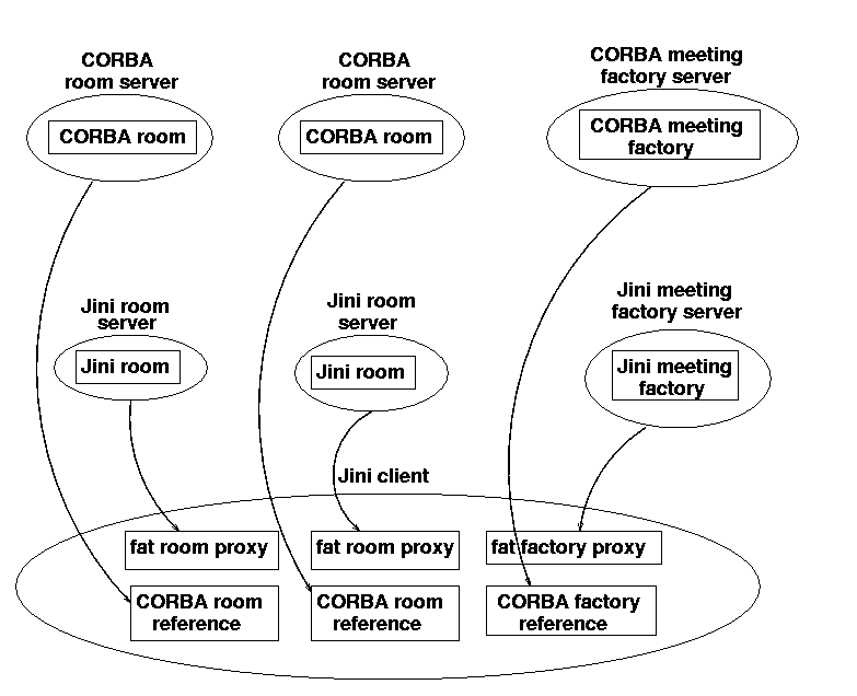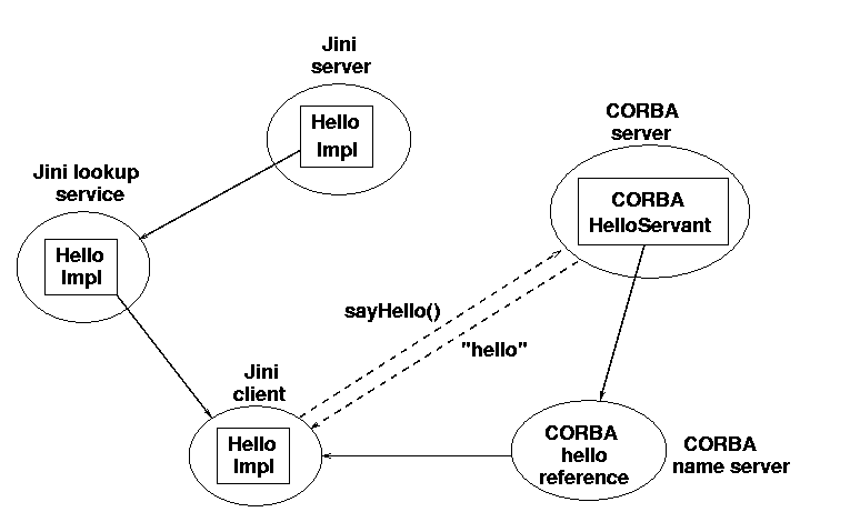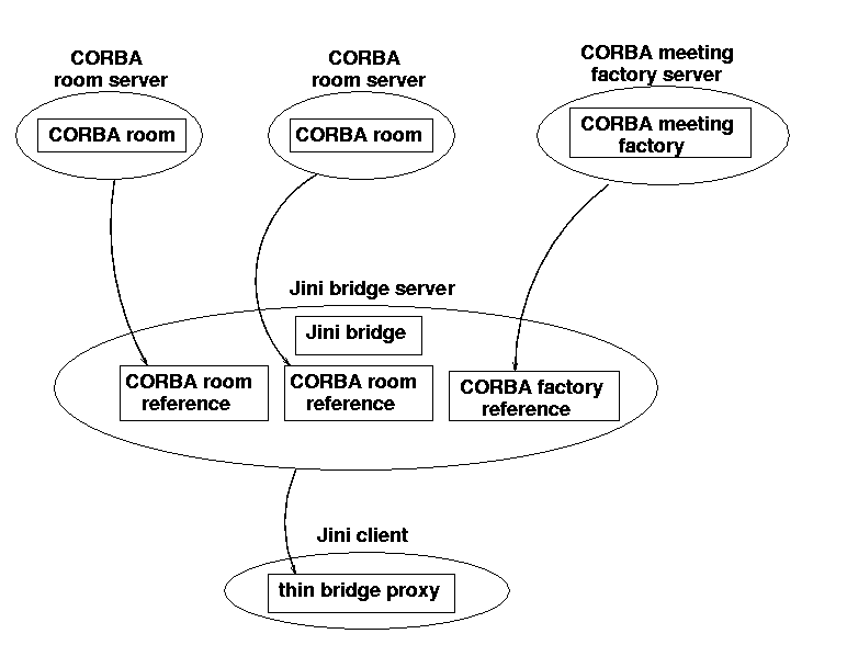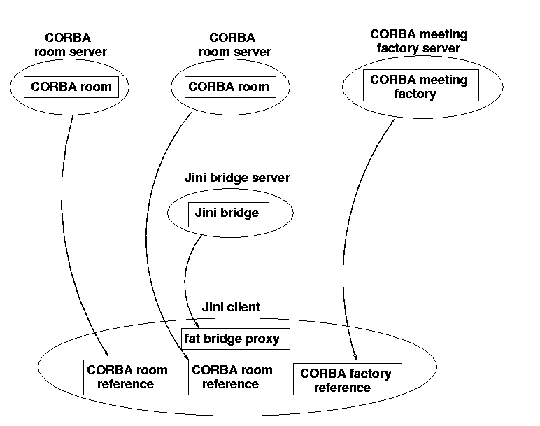 Most CORBA implementations use IIOP - that is, they are TCP based. The current Jini implementation is also TCP based. So there is a confluence of transport methods, which normally would not occur. A bridge would usually be fixed to a particular piece of hardware, but here it is not necessary due to this confluence.