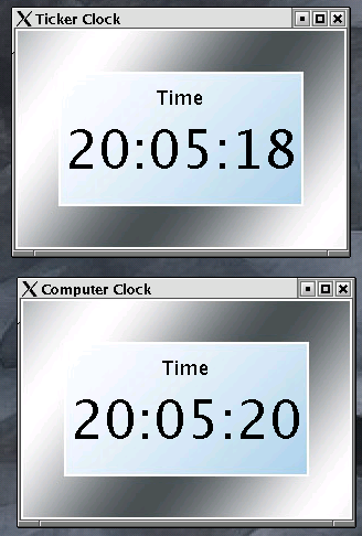 To make this more visual, we can put the timers into a Swing frame and watch them ticking away. The following code is based on that of Satoshi Konno for UPnP