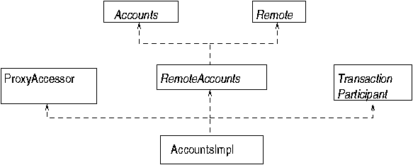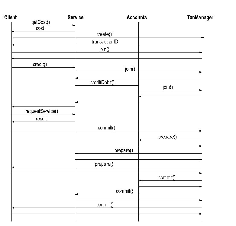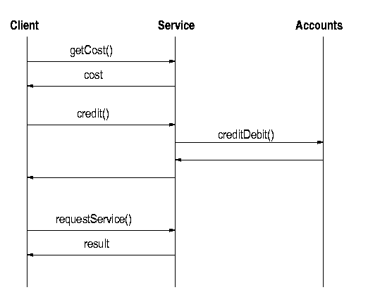 The classic use of transactions is to handle money transfers between accounts. In this there are two accounts, one of which is debited and the other credited. This is not too exciting as an example, so we shall try a more complex situation. A service may decide to charge for its use. If a client decides this cost is reasonable, it will first credit the service and then request that the service be performed. The actual accounts will be managed by an accounts service, which will need to be informed of the credits and debits that occur. A simple accounts model is that the service gets, say, a customer ID from the client, and passes its own ID and the customer ID to the accounts service which manages both accounts. Simple, prone to all sorts of e-commerce issues that we have no intention of going into, and similar to the way credit cards work!