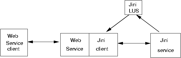 Just looking at the case of a Jini client talking to a Web Service, this can lead to several models, as pictured in the figures. In the first, the proxy can be an ordinary (e.g. Jeri) proxy talking back to its service. This service also acts as a Web Service client.
